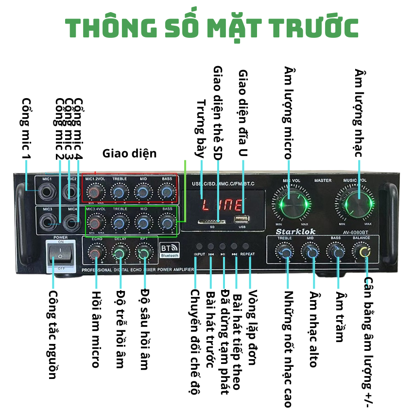 Amply karaoke bluetooth Starklok AV6030BT, âm ly karaoke nghe nhạc cao cấp cho gia đình, amly 7.1, amply công suất lớn