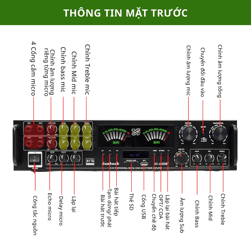 → Điều chỉnh âm lượng – bass – treble micro, hát nhẹ, không mệt tiếng.