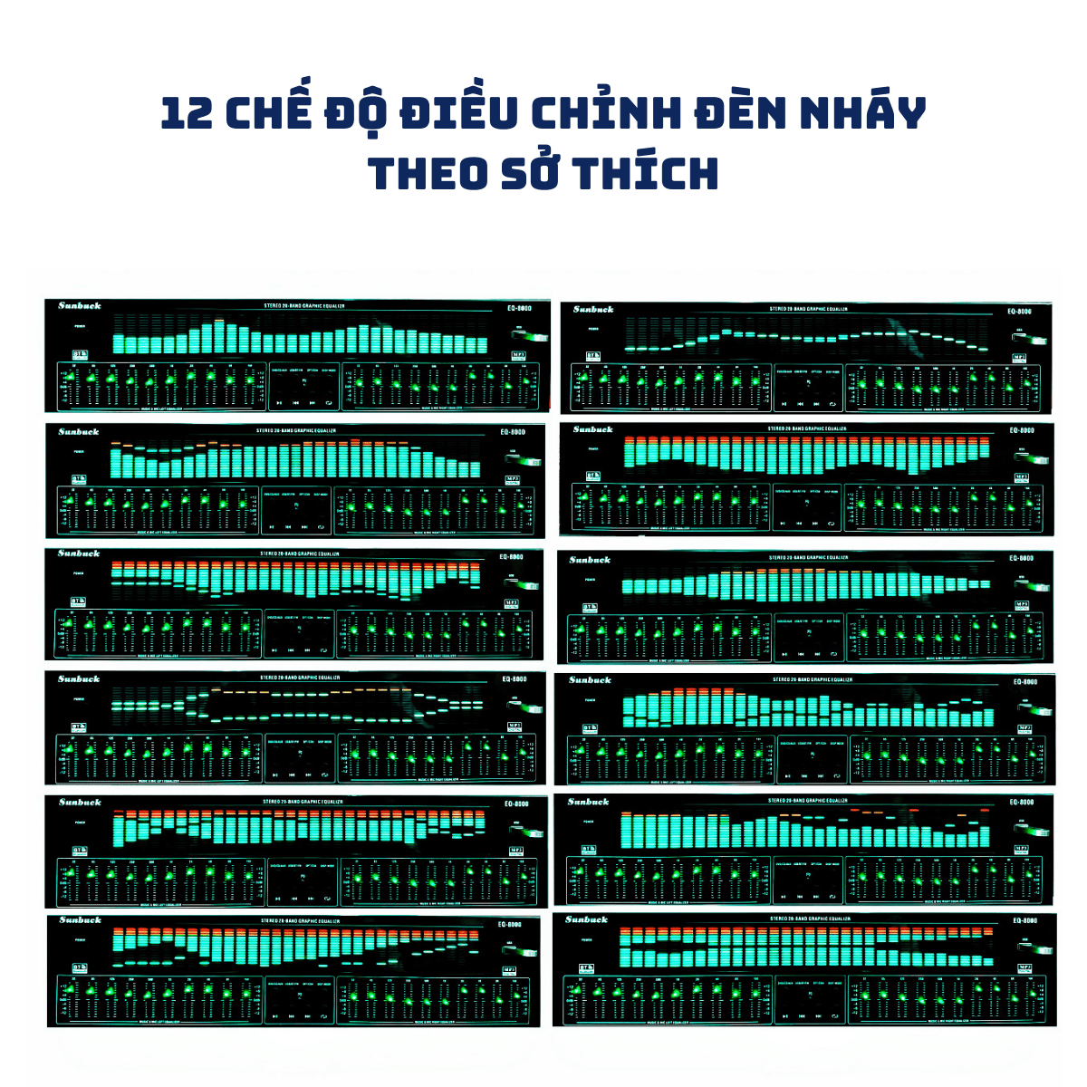 - Mặt trước của sản phẩm được bố trí cần gạt, nút ấn điều chỉnh kênh và hệ thống đèn LED hiển thị rất đẹp mắt với 12 kiểu để thay đổi